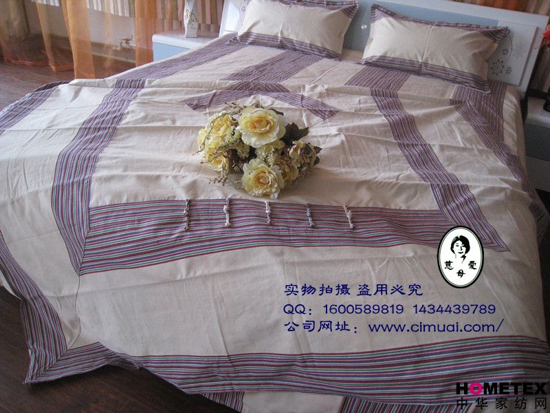 慈母愛”牌老粗布床品有著其他床品不可比擬的優(yōu)越性: (一)、綠色天然、環(huán)保健康、主要原料是100%純棉線制成,從種植到手織布制品,不使用農(nóng)藥和化學染劑,紡織品不含甲醛,偶氮等化學重金屬離子,完全符合歐共體紡織品生化標準規(guī)定:“禁用致癌偶氮染料的要求”,是真正的綠色生態(tài)紡織珍品。 (二)、冬暖夏涼、透氣吸汗 柔軟舒適,透氣吸汗,適用于貼身使用;吸附人體皮膚上的汗水和微汗,使體溫迅速恢復正常。 (三)、抗靜電、防螨止癢,親合肌膚,有人類“第二肌膚”之稱。PH值呈酸性,對皮膚無刺激;符合環(huán)保及健康要求。 (四)、線粗紋深,質(zhì)地厚重,不卷邊 不褪色、不易搓起、不起球(純棉縫制,不帶自由電荷,棉纖維不易變形)不卷邊,由于粗布線粗、紋深,其表面形 成無數(shù)個按摩點對人體有意想不到的按摩作用。 (五)、綠色保健、改善睡眠, 使用老粗布使人體產(chǎn)生溫熱效應,特別是彩棉的紅外線作用于人體,增加人體的微循環(huán)血流,激活組織細胞,有效的調(diào)節(jié)神經(jīng)系統(tǒng),疏通經(jīng)絡,改善睡眠質(zhì)量.融自然、和諧、綠色、環(huán)保、健康于一體,是現(xiàn)代人返樸歸真、回歸自然的時尚佳品.
